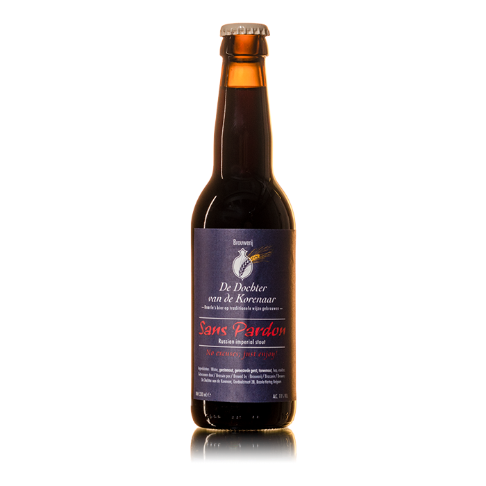 La bière belge Stout Sans Pardon de la brasserie Korenaar est une référence pour les amateurs de bières noires très fortes en alcool. Fondée en 2008 à Nederzwalm, cette brasserie artisanale est devenue une référence en Belgique. Outre Sans Pardon, Korenaar propose une large gamme de bières artisanales. Avec un taux d'alcool de 11%, Sans Pardon est une bière à partager en bonne compagnie.La Sans Pardon offre des saveurs café et chocolat typiques des Imperial Stouts mais également une saveur fruitée qui provient de l'utilisation de Rooibos.